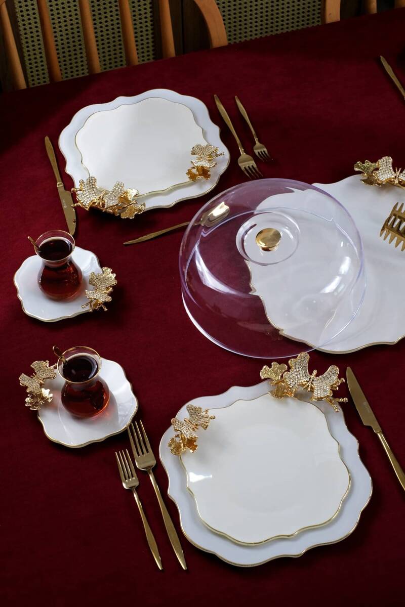 Glore Dolmabahçe Lotus Taşlı Kelebek Altın Yaldızlı 6 Kişilik 34 Parça Pasta Servis Takımı