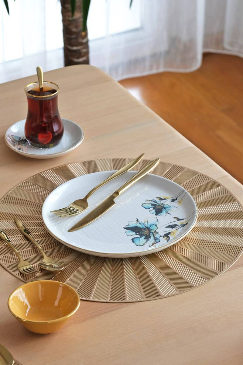 Glore Asya Blue Flower 32 Parça 6 Kişilik Altın Yaldızlı Seramik Kahvaltı Takımı
