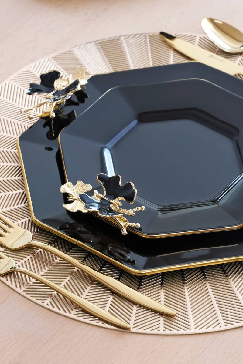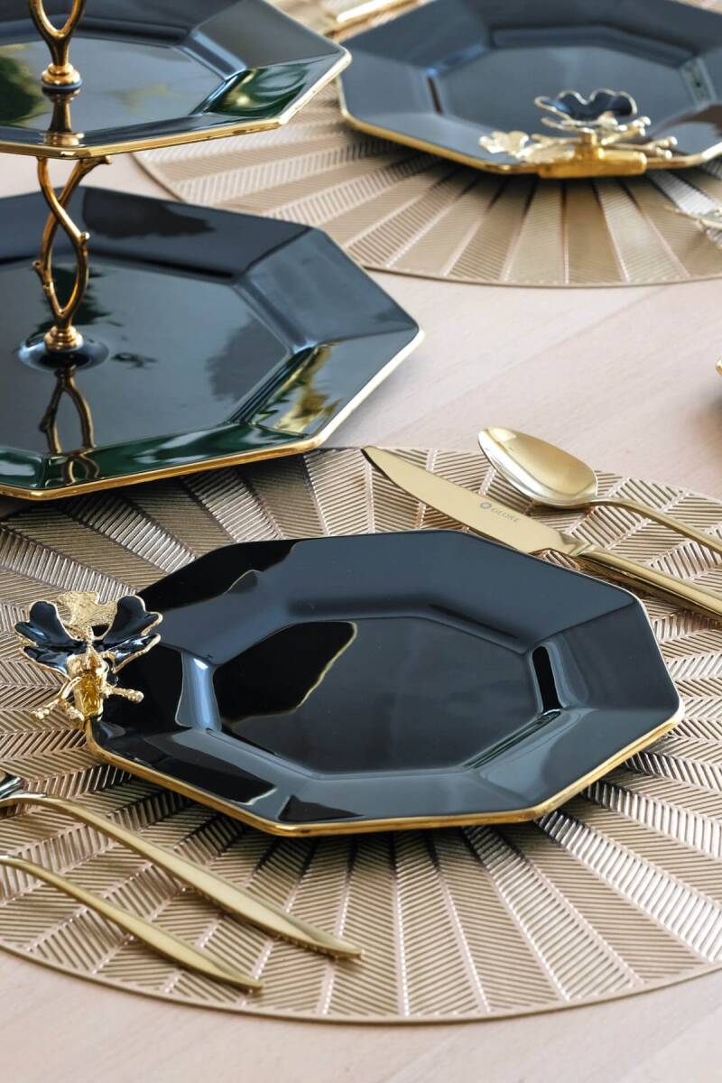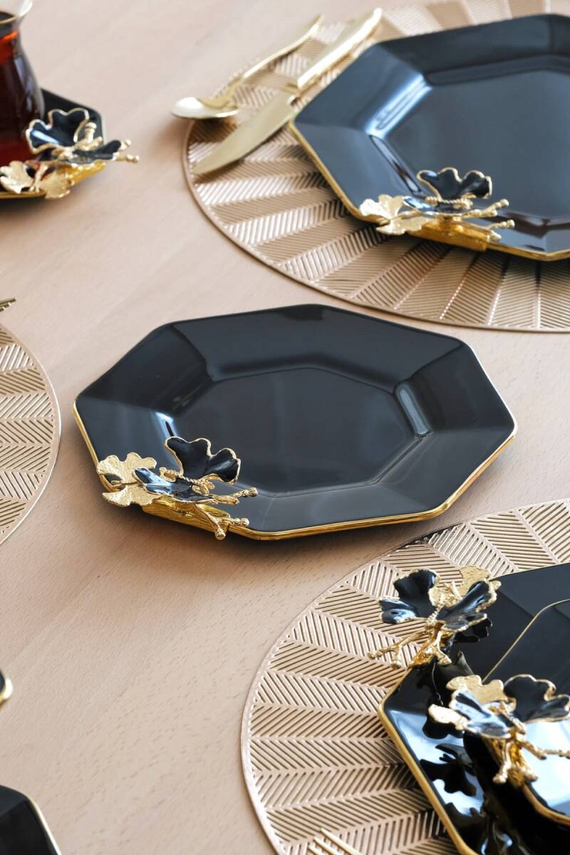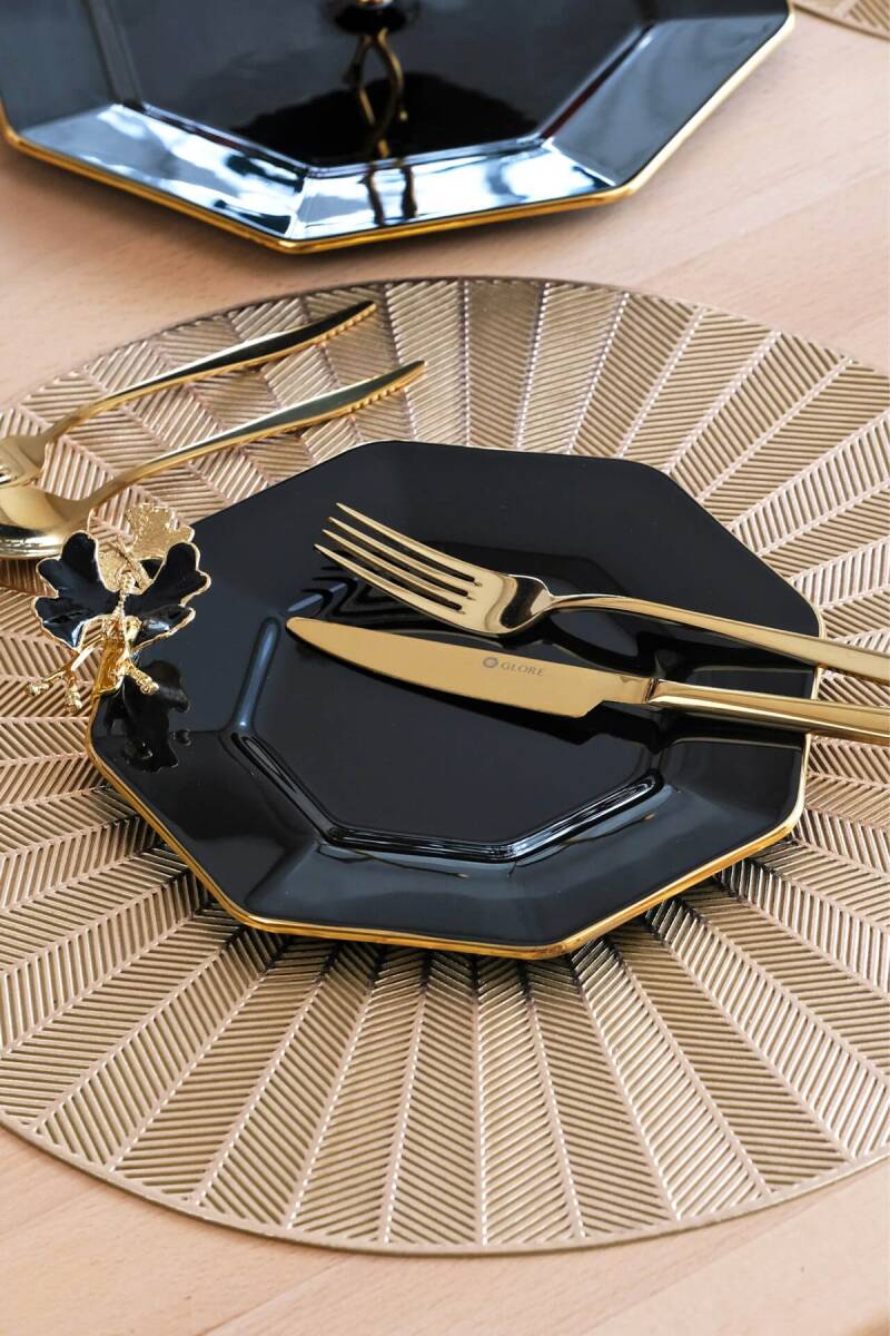 Glore Dolmabahçe Sekizgen Siyah 6 Kişilik Altın Yaldızlı Cam Pasta Tabağı Takımı