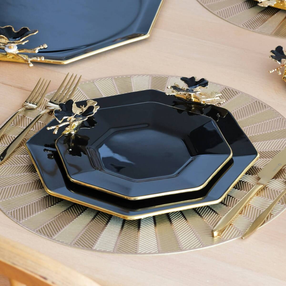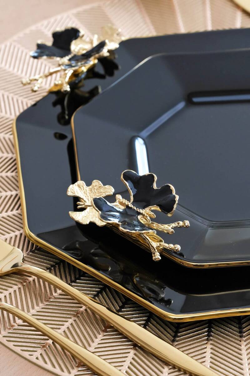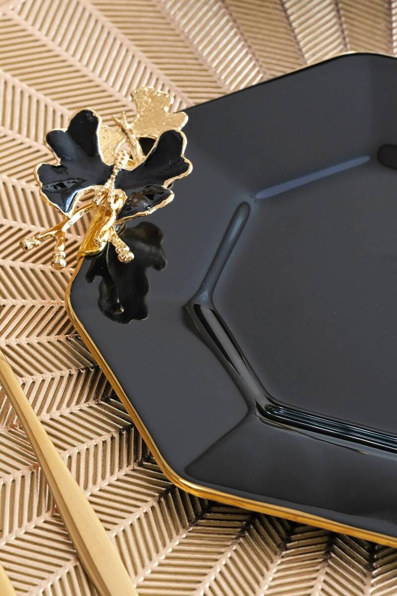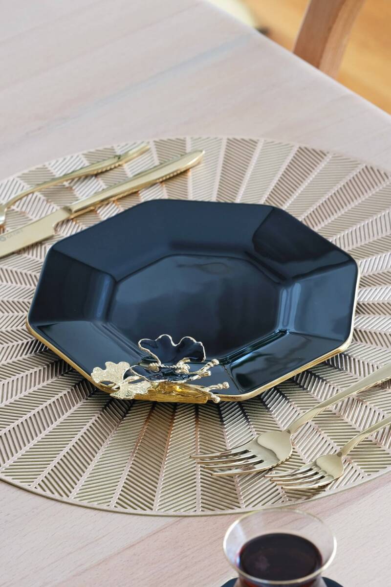 Glore Dolmabahçe Sekizgen Siyah 6 Kişilik Altın Yaldızlı Cam Pasta Tabağı Takımı
