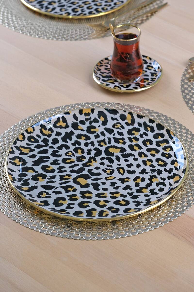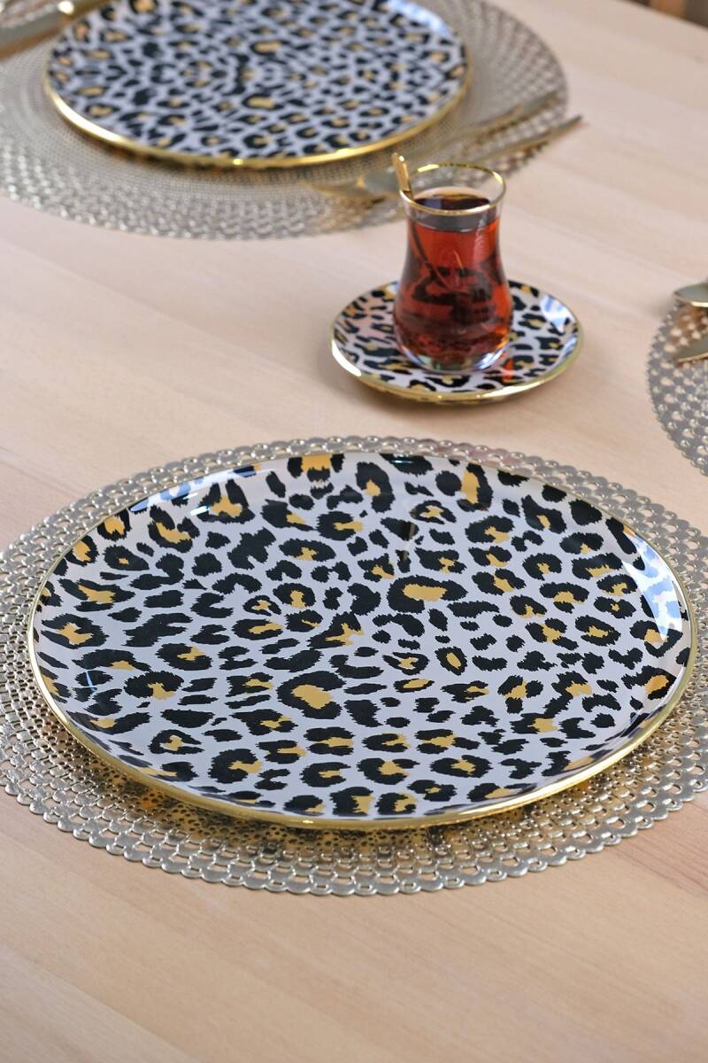 Glore Leopar Somon Altın Yaldızlı 6 Kişilik 13 Parça Tepsili Çay Takımı