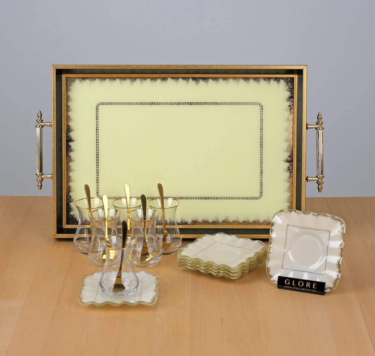 Glore Kare Latte Şeffaf 19 Parça 6 Kişilik Altın yaldızlı Tepsili Çay Seti
