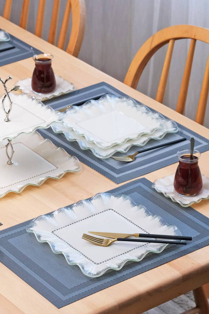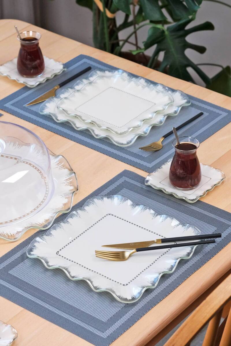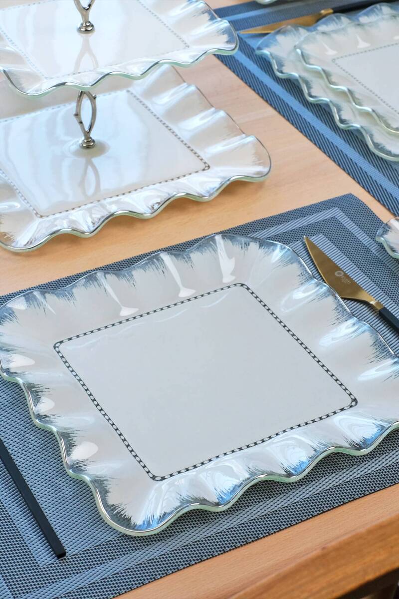 Glore Kare Latte Şeffaf 6 Kişilik Platin Yaldızlı Cam Servis Tabağı Takımı