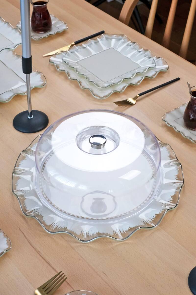 - 1 adet 31cm şeffaf platin yaldızlı cam kek tepsisi