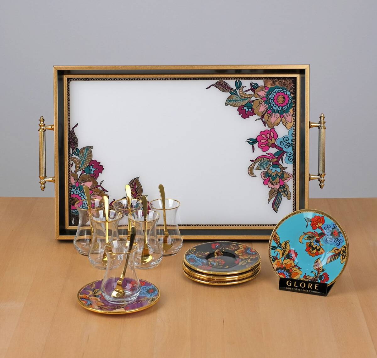 Glore Lorena Asorti19 Parça 6 Kişilik Altın yaldızlı Tepsili Çay Seti