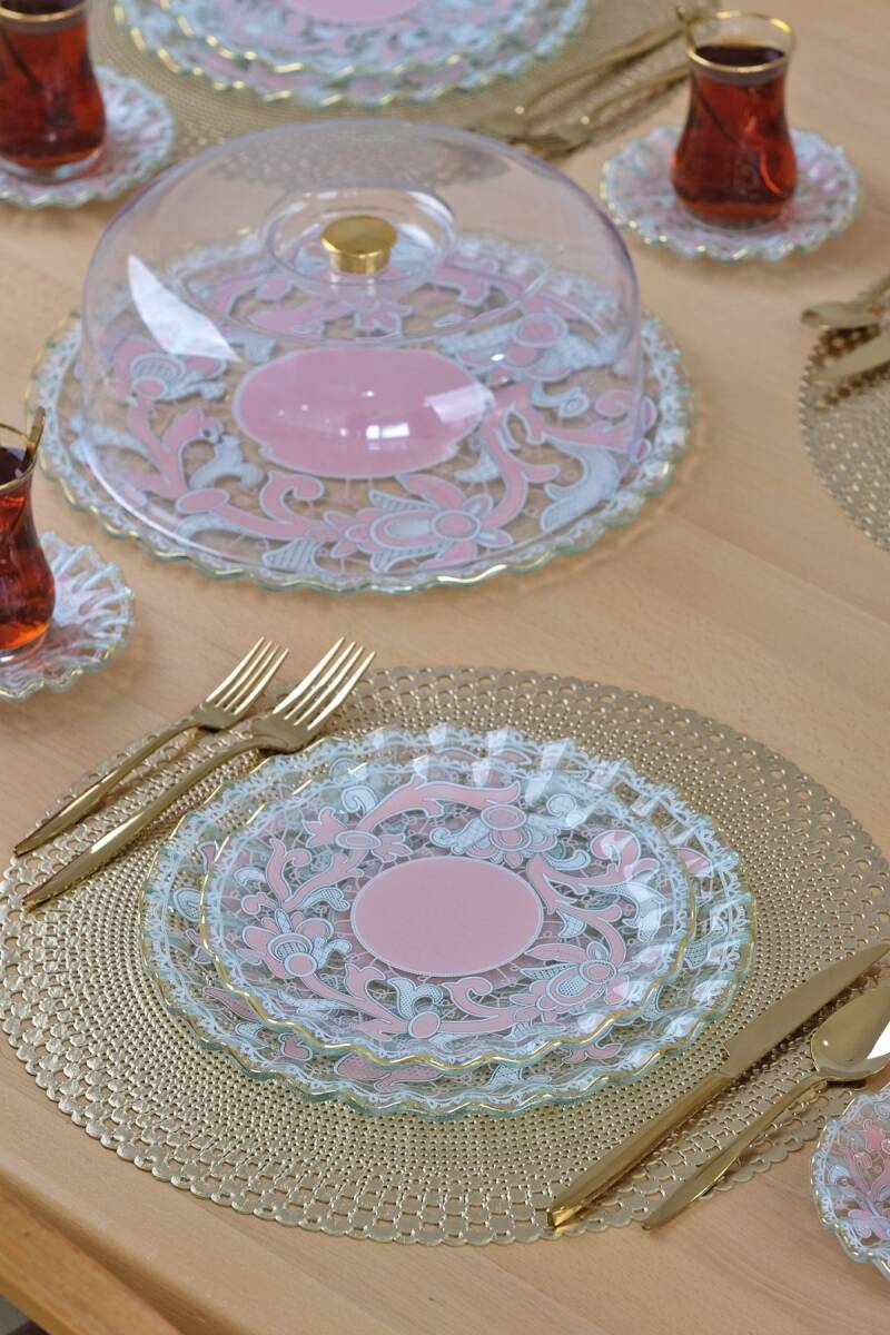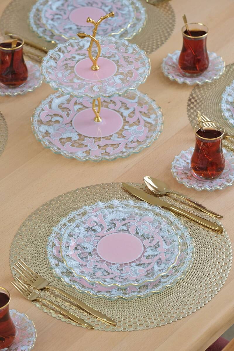 Glore Padona Şeffaf Altın Yaldızlı 6 Kişilik 28 Parça Pasta Çay Servis Takımı