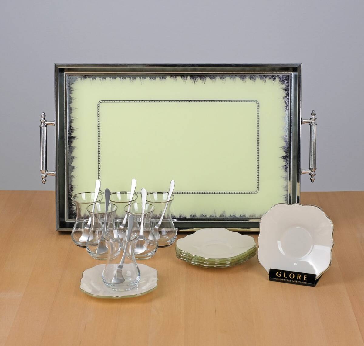 Glore Solid Krem Lotus Platin 19 Parça 6 Kişilik Tepsili Çay Seti