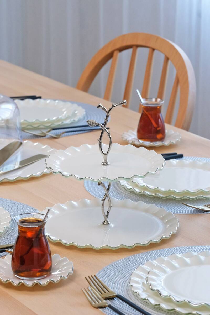 Glore Solid Krem Wavy Platin Yaldızlı 6 Kişilik 34 Parça Pasta Servis Takımı